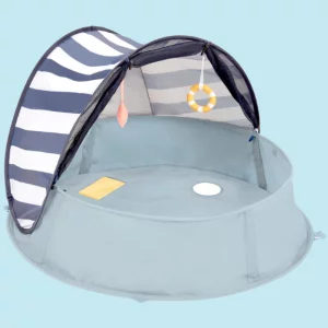 It’s worth remembering to stay in the shade and avoid the midday sun due to babies’ sensitive skin and carefully consider the water temperature, ensuring it’s not too hot or too cold.