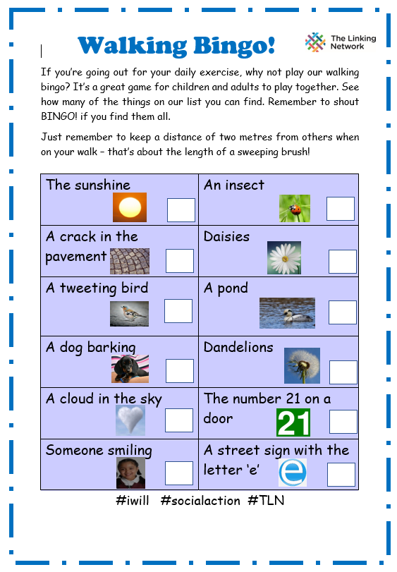1. Jump the cracks on the paving stones, the cracks are fire and so don't burn your toes! depending on where you are, you can go further, avoid the pavement, walk on the wall/grass/kerb etc, obviously this depends on where you are and what is safe. dd1 used to hop and jump all the way home from school, as black tarmac was lava and grey tarmac/paving slabs were OK.