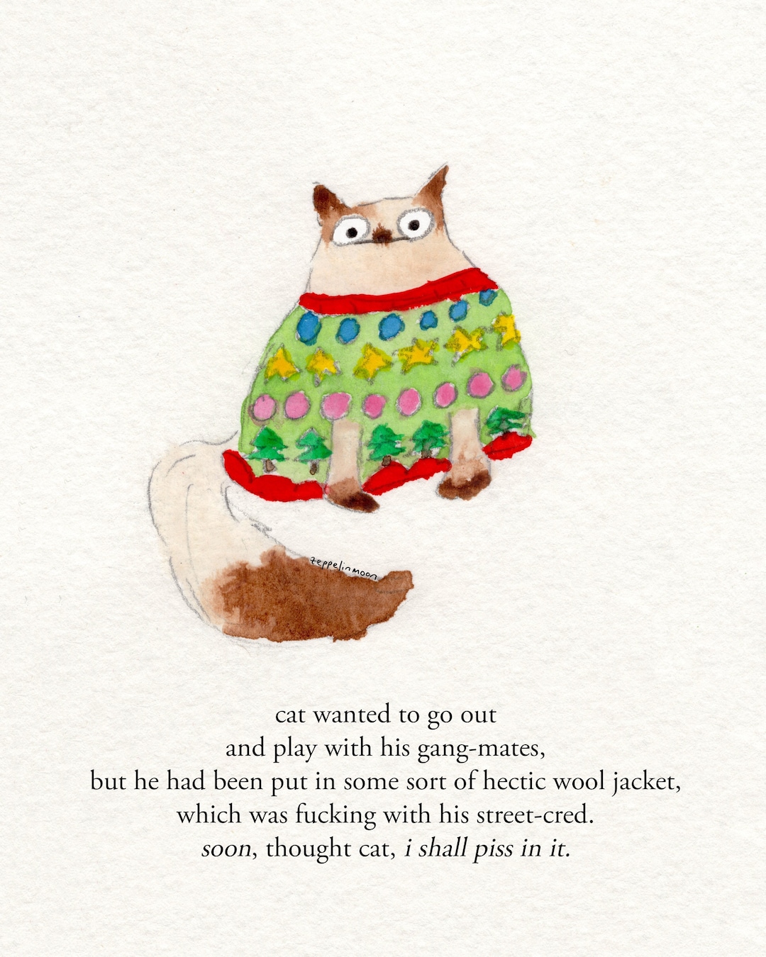 You can get coats for cats. We had a little camouflage one for boycat when he was a kitten, partly as it was just at the start of the pandemic and he was so little and it was a wee bit cold. He tolerated it as he's a stoic little chap but it's fair to say he didn't like it...