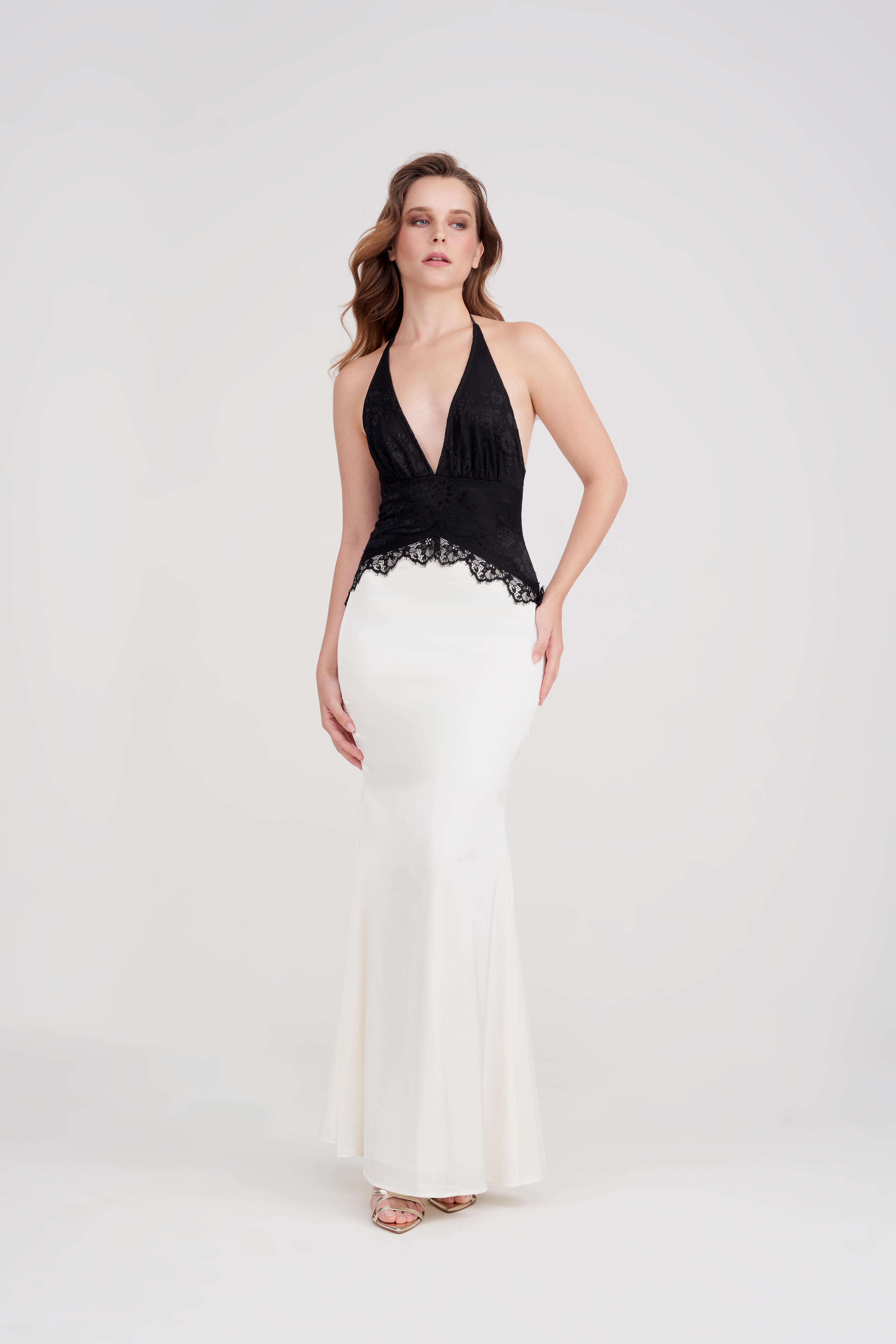 Classic. Commanding. Effortless. The ADEL Lace and Satin Halter Gown is an ode to contrast. Delicate lace meets liquid satin in a silhouette that celebrates form. A plunging halter neckline frames the décolletage, its stretchy lace bodice tied effortle...