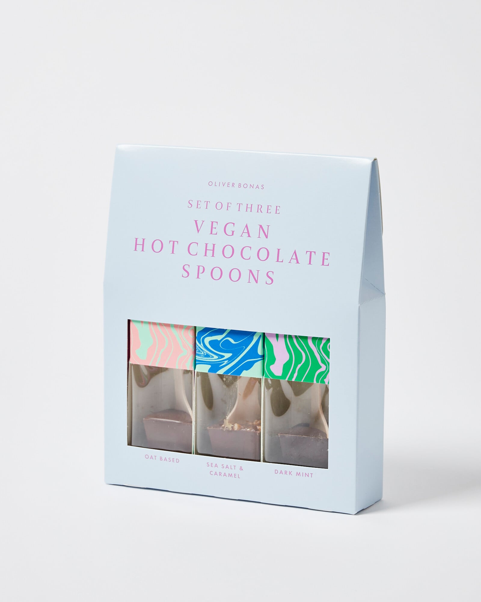 Individually wrapped in a marble-inspired print designed in the OB studios, choose from three flavours of vegan chocolate spoons. Place in a mug and pour hot liquid over each one to melt.