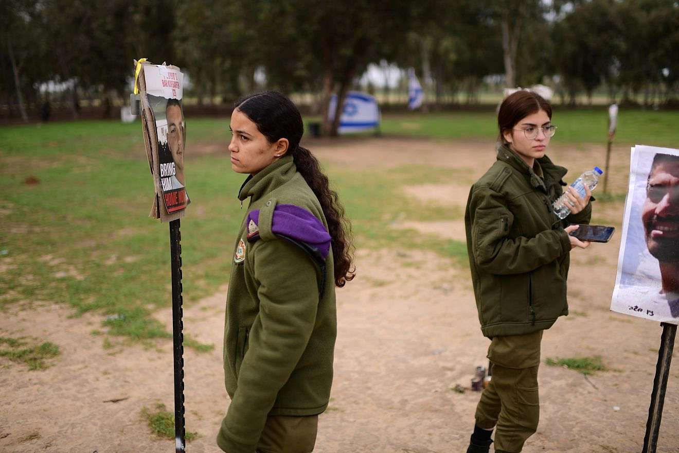 Israeli soldiers hug as they look at pictures of the Nova music festival victims at the site of the festival near Kibbutz Reim