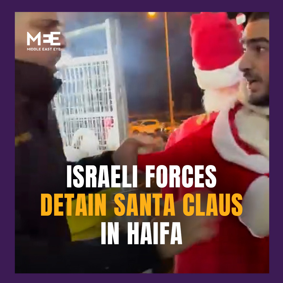 Israeli officers closed an event celebrating Christmas on Sunday, confiscating equipment, and arresting the Palestinian Santa Claus, as well as a DJ and a street vendor. In a video, police can be seen pushing the men to the ground and handcuffing them as bystanders watched.”