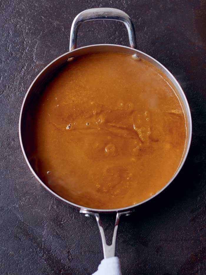 Simmer the liquid for 20 to 30 minutes until about 400ml remains. Mix the cornflour with two tablespoons of water and whisk into the stock. Cook for three or four minutes until thickened. Adjust seasoning to taste.