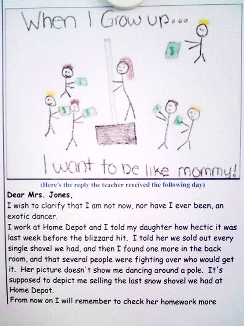 I remember getting an email once from my MIL. It was about a picture that had been drawn by a 6 year old (I believe) the woman appeared to be pole dancing and men were all crowded around holding out £5 notes. The child in question had been asked to draw what his mummy did for a living.