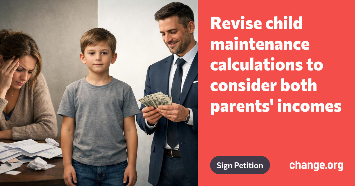 A local woman has started this petition and after reading the numerous accounts of women going through the same I thought I'd share here [[https://www.change.org/p/revise-child-maintenance-calculations-to-consider-both-parents-incomes?best_share_visual=1&recruited_by_id=23740b40-25d7-11f1-9102-23c3a919e7ba&utm_source=share_petition&utm_campaign=psf_promote_or_share&utm_medium=copylink&share_id=7nDLmd6PV8 https://c.org/7nDLmd6PV8]]