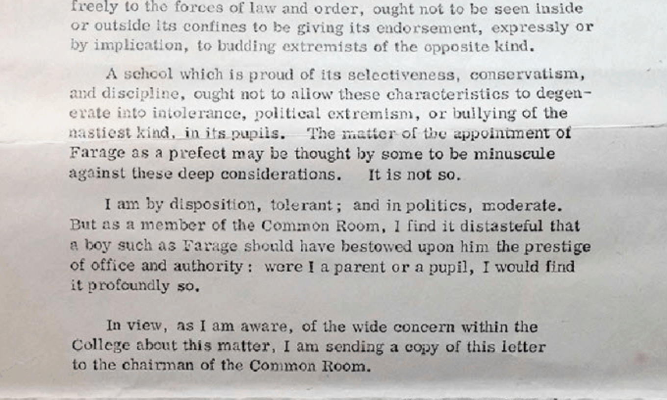 Letter resurfaces from Nigel Farage's schooldays warning of “racist” and “fascist” tendencies