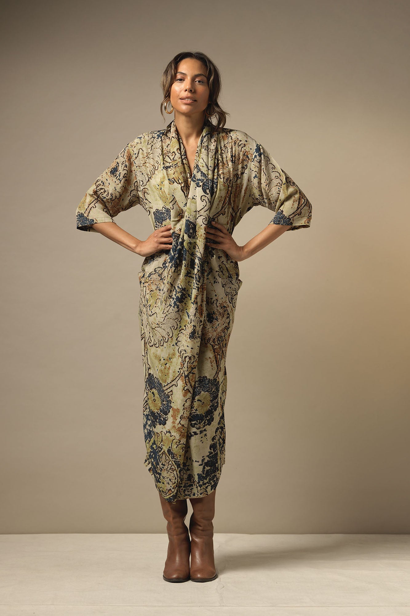 A print inspired by traditional hand-woven antique rugs from across the globe.  This cowl neck, V-line dress features a pin tuck front, and pockets and can be styled loose or worn with a belt to create a beautiful silhouette.
