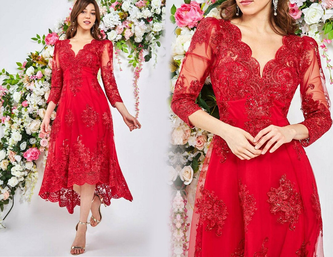 Scalloped Lace High Low Midi Dress Red Wedding Guest Dress - Etsy UK