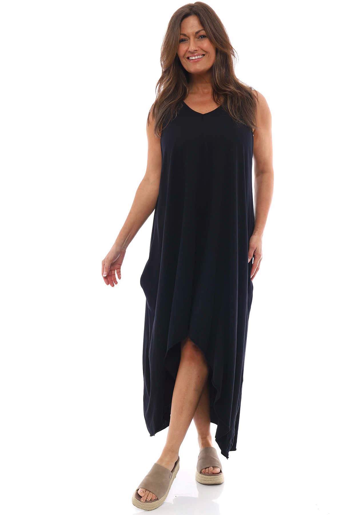 I would say it’s either cotton or linen material, airy light like a tunic style- sleeveless.