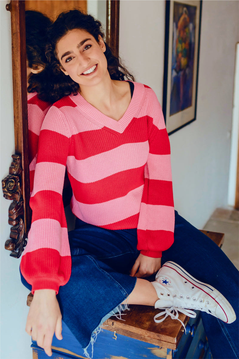 If you want brightly coloured, reasonably priced, v-neck sweaters, try Uniqlo. I can really recommend their Merino wool range, which is soft against the skin, fairly lightweight, so excellent for layering and when machine washed on a wool/delicates setting, last for ages! Their lambs wool and cashmere are also very reasonably priced and wash very well and there are loads of colours to choose from!