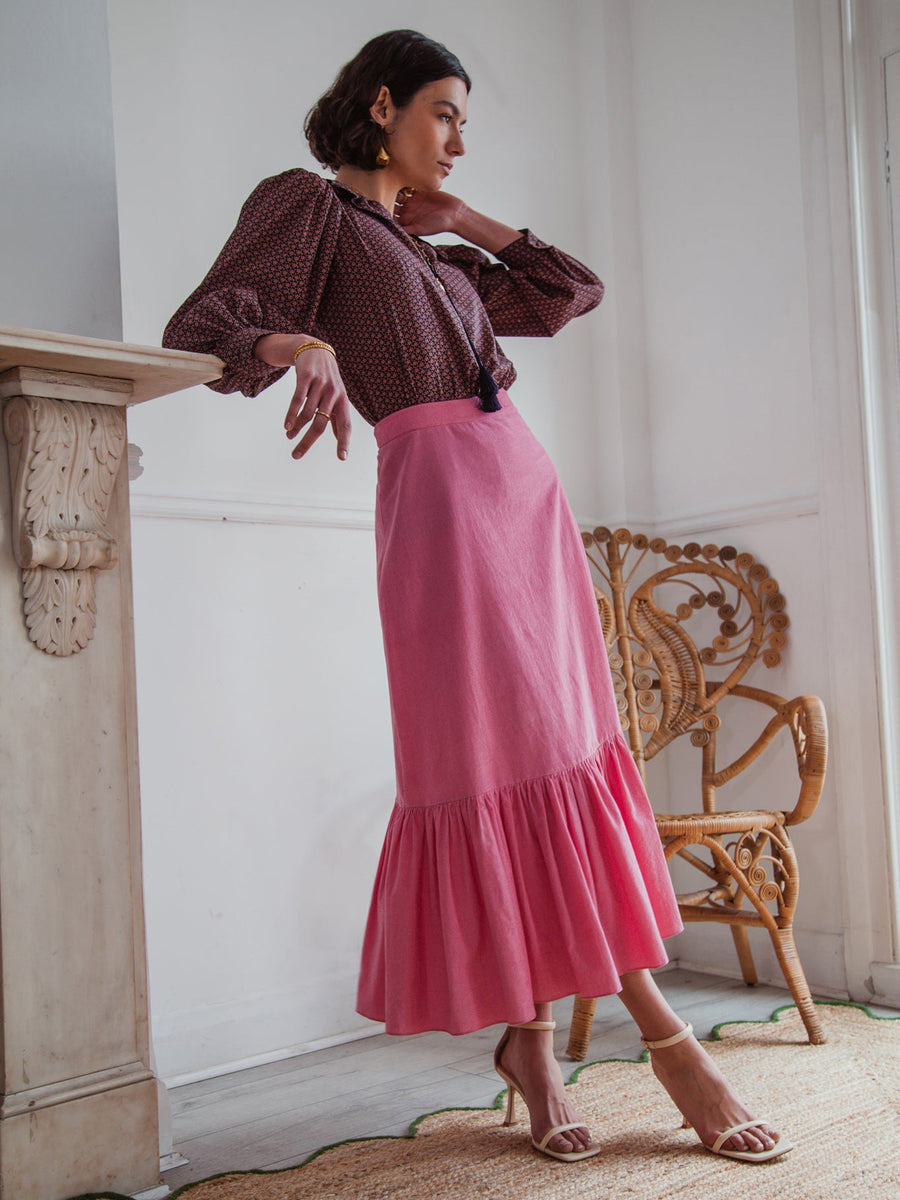Mirroring the gathered tiers of its namesake dress silhouette, the Nalini skirt has been fabricated using the same 100% soft-to-touch cotton corduroy in a beautiful pink colour. This midi tiered skirt falls beautifully in an A-line silhouette, partneri...