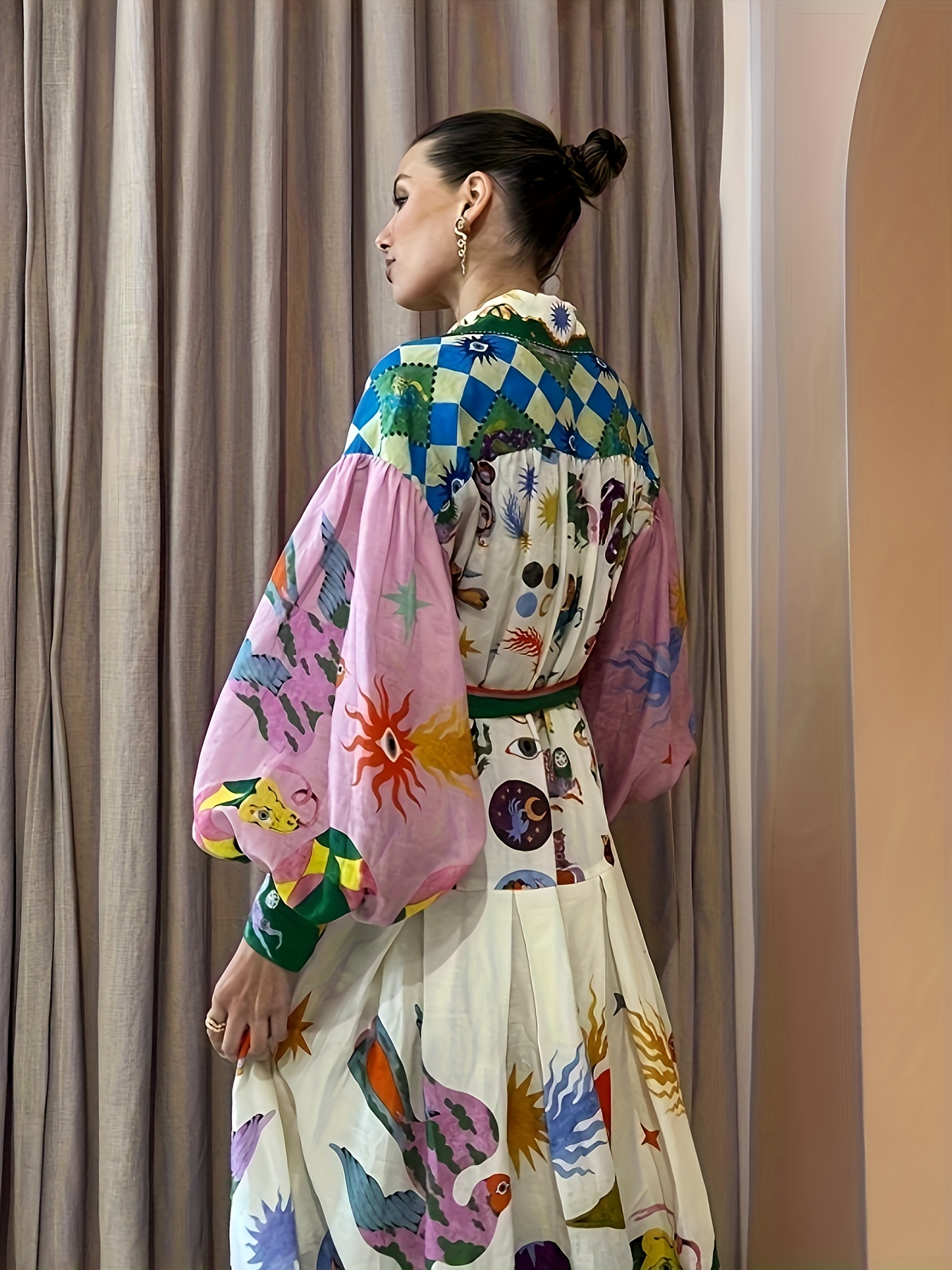 Plus Size Trendy Dress, Women's Plus Abstract Print Lantern Sleeve Lapel Collar Maxi Dress With Belt