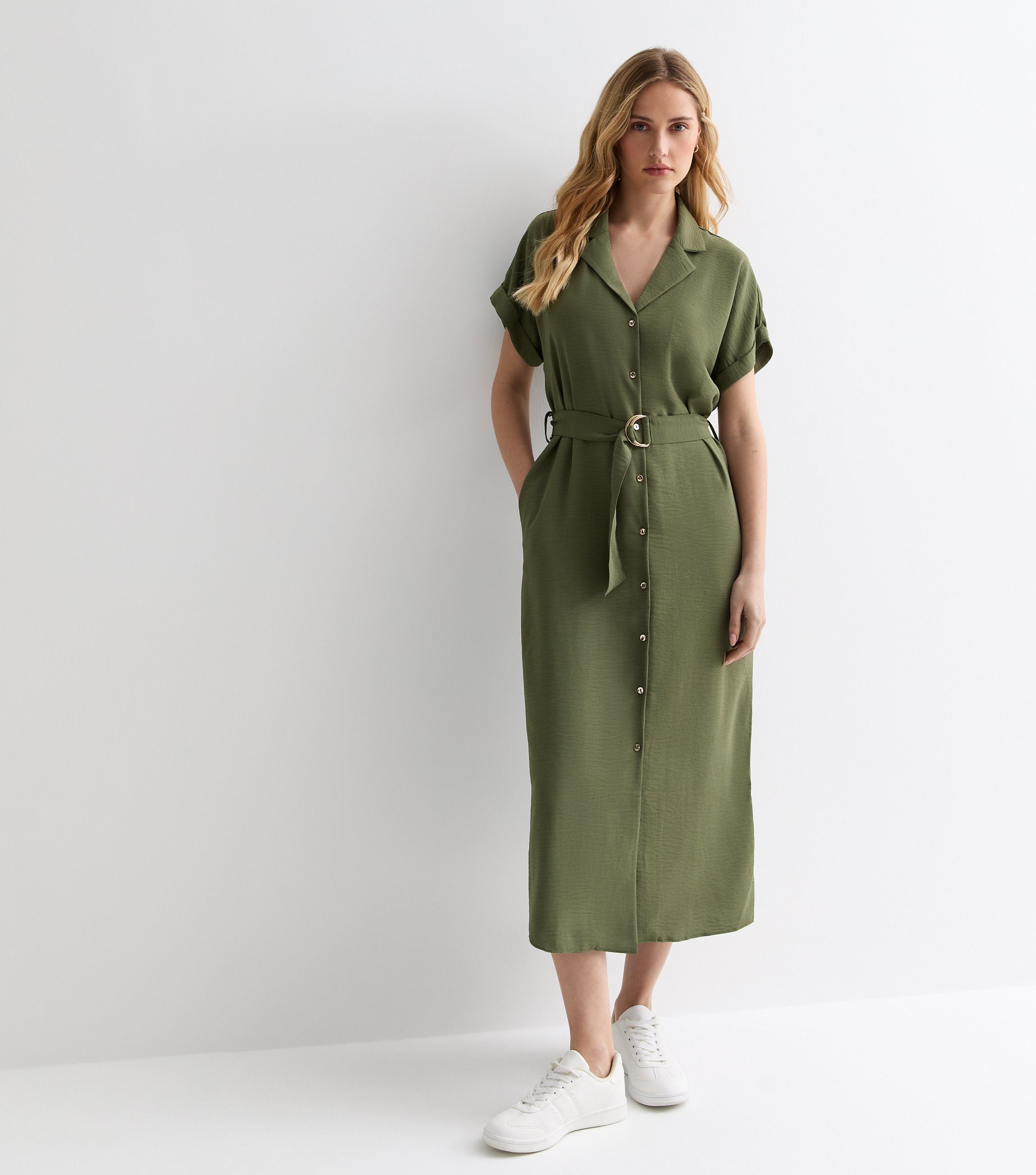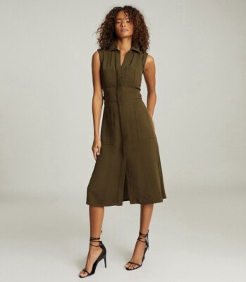 The nearest I can find is this dress from Mango but it was a darker almost khaki green, the fabric had a sheen and it wasn't so full skirted. It just skimmed the hips and is ankle length, also had short, turned up sleeves. Please help me find it Here's the Mango dress