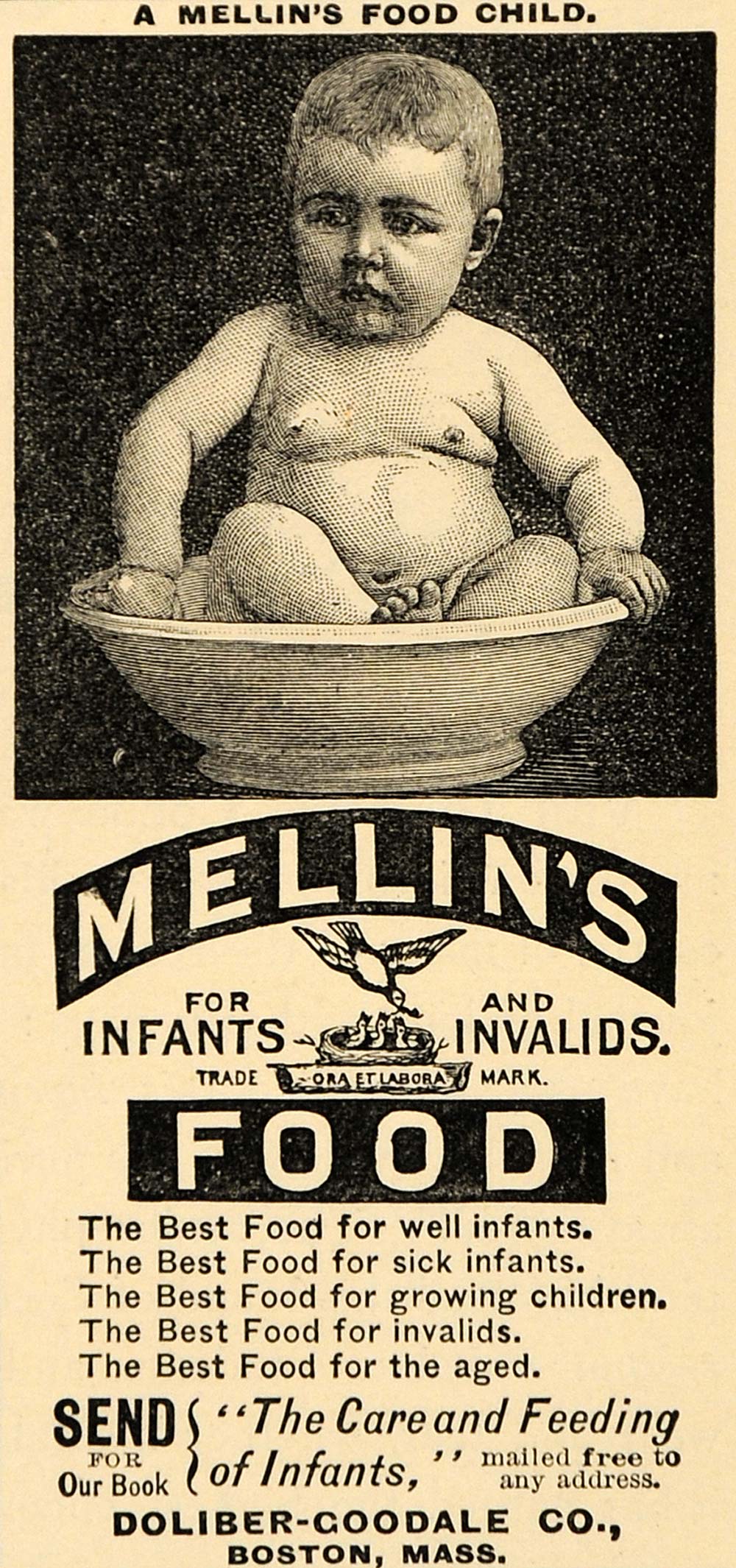 Advertisment stating that their formula milk is the best food for infants. They also played on the fact that people viewed a healthy baby as a chunky one, so displayed pictures of chunky, robust babies as 'a melin's food baby'.