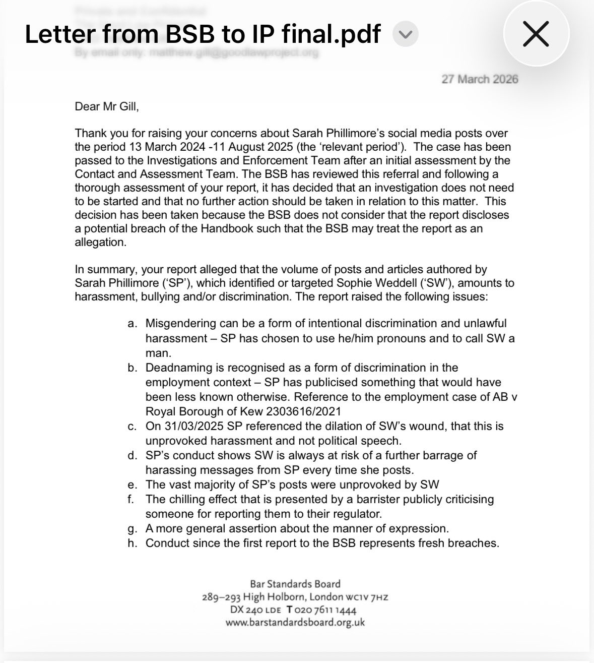 The only thing is other TAs have already tried this on Phillimore multiple times. They went to the Bar Council their claims were dismissed. They all failed. More to the point this ‘Kate’ is the same guy complaining again who already failed. Sarah Phillimore knows the law and likes explaining it to TAs and making them lose. So she doesn't even resent the attempt.