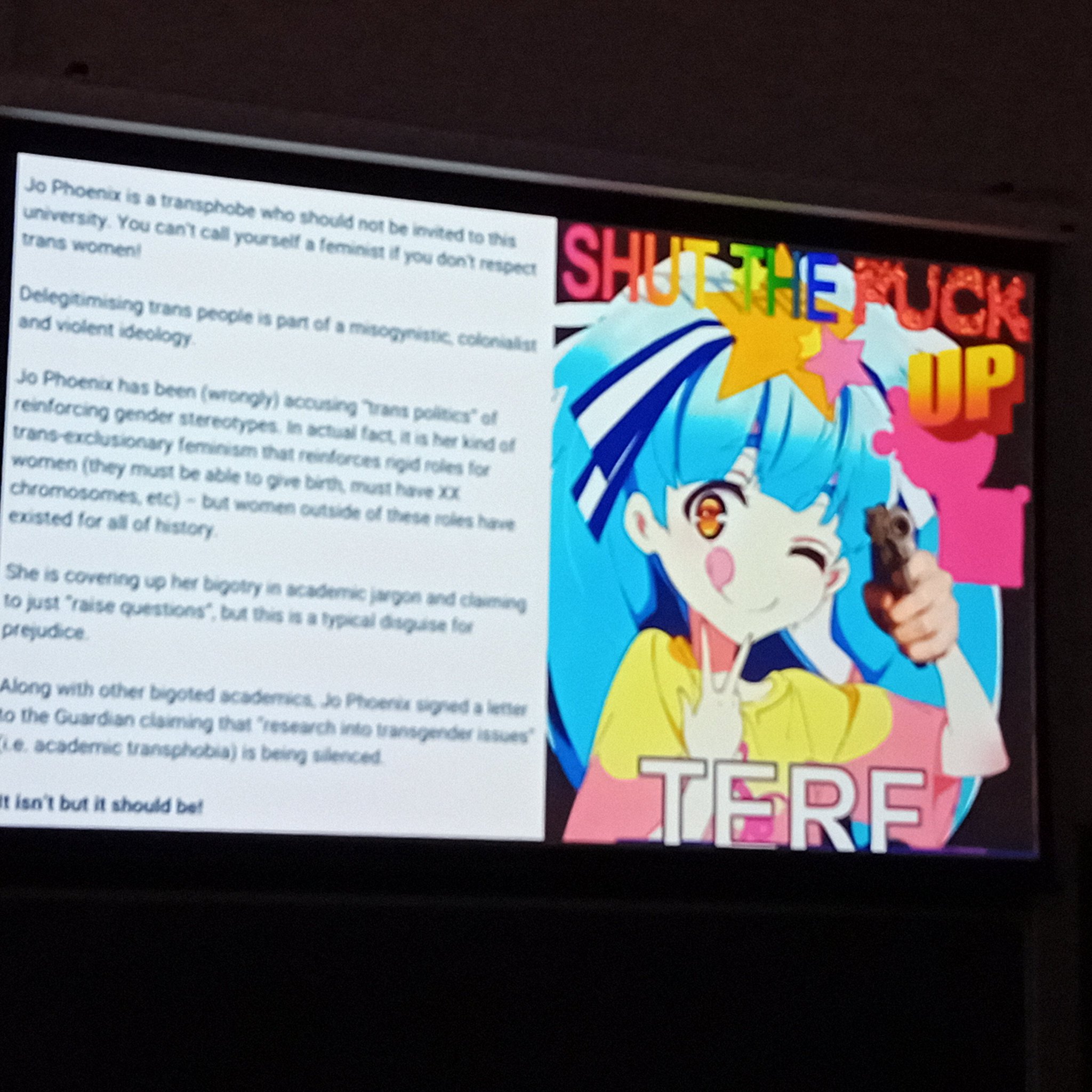 Widespread violent threats on social media documented by website "Terf is a Slur" - rape and death threats against women.
