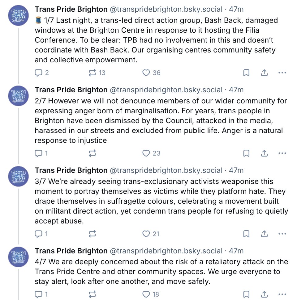 Trans Pride Brighton statement on the FiLiA attack: Excuses the violence. Accuses target of "weaponising" attack. "Deeply concerned about the risk of a retaliatory attack" The DARVO is off the scale.