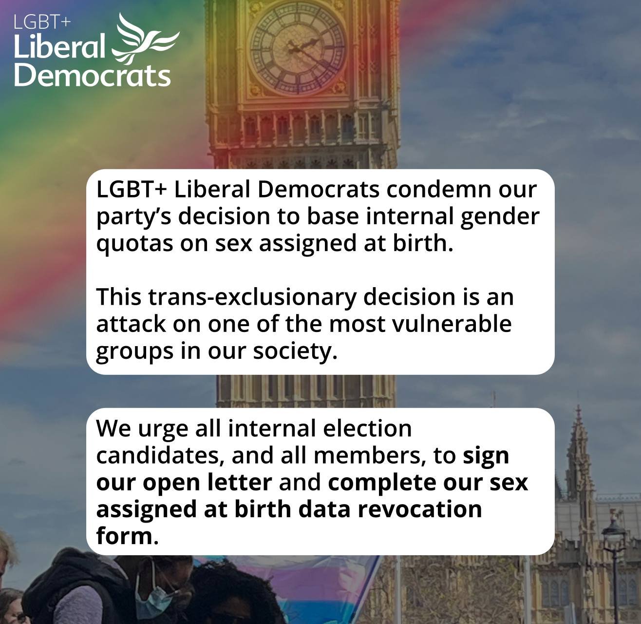 "LGBT+ Liberal Democrats condemn our party's decision to base internal gender quotas on sex assigmed at birth."