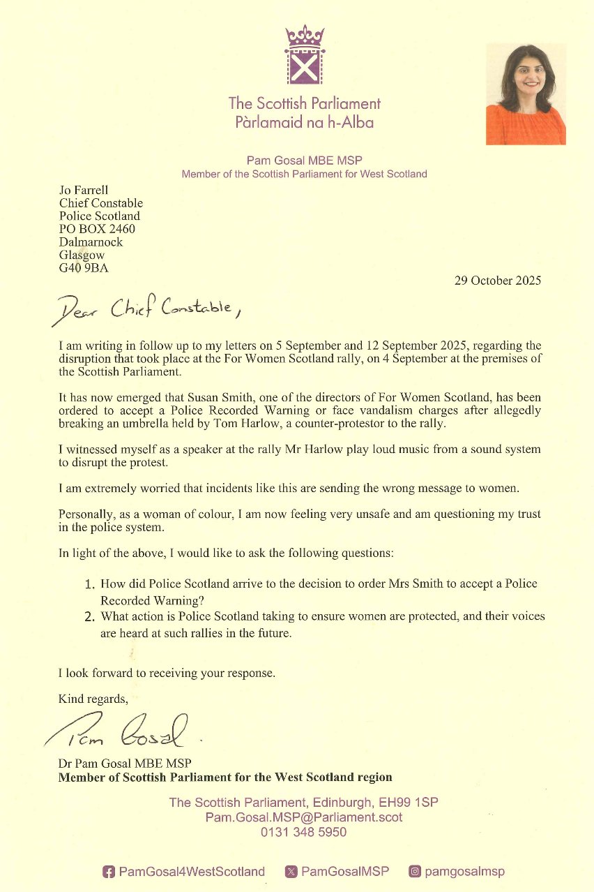 Climbdown from Police Scotland here? They say they will 'review' the attempt to issue a Recorded Police Warning to For Women Scotland's Susan Smith.