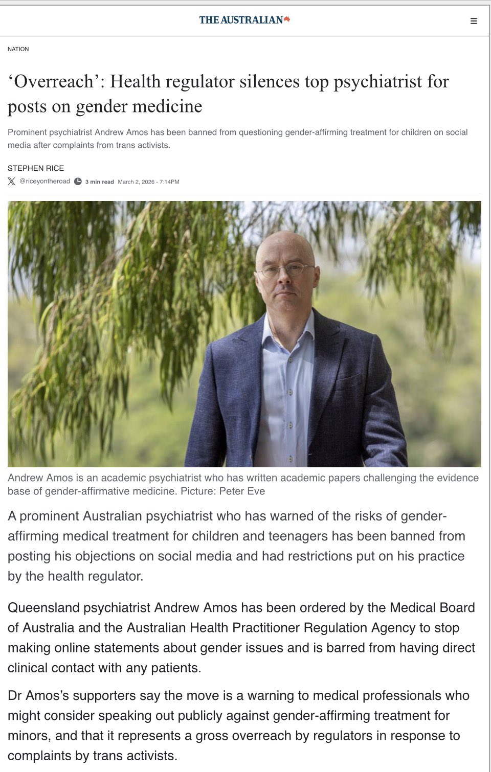 'Overreach': Health regulator silences top psychiatrist for posts on gender medicine Prominent psychiatrist Andrew Amos has been banned from questioning gender-affirming treatment for children on social media after complaints from trans activists.