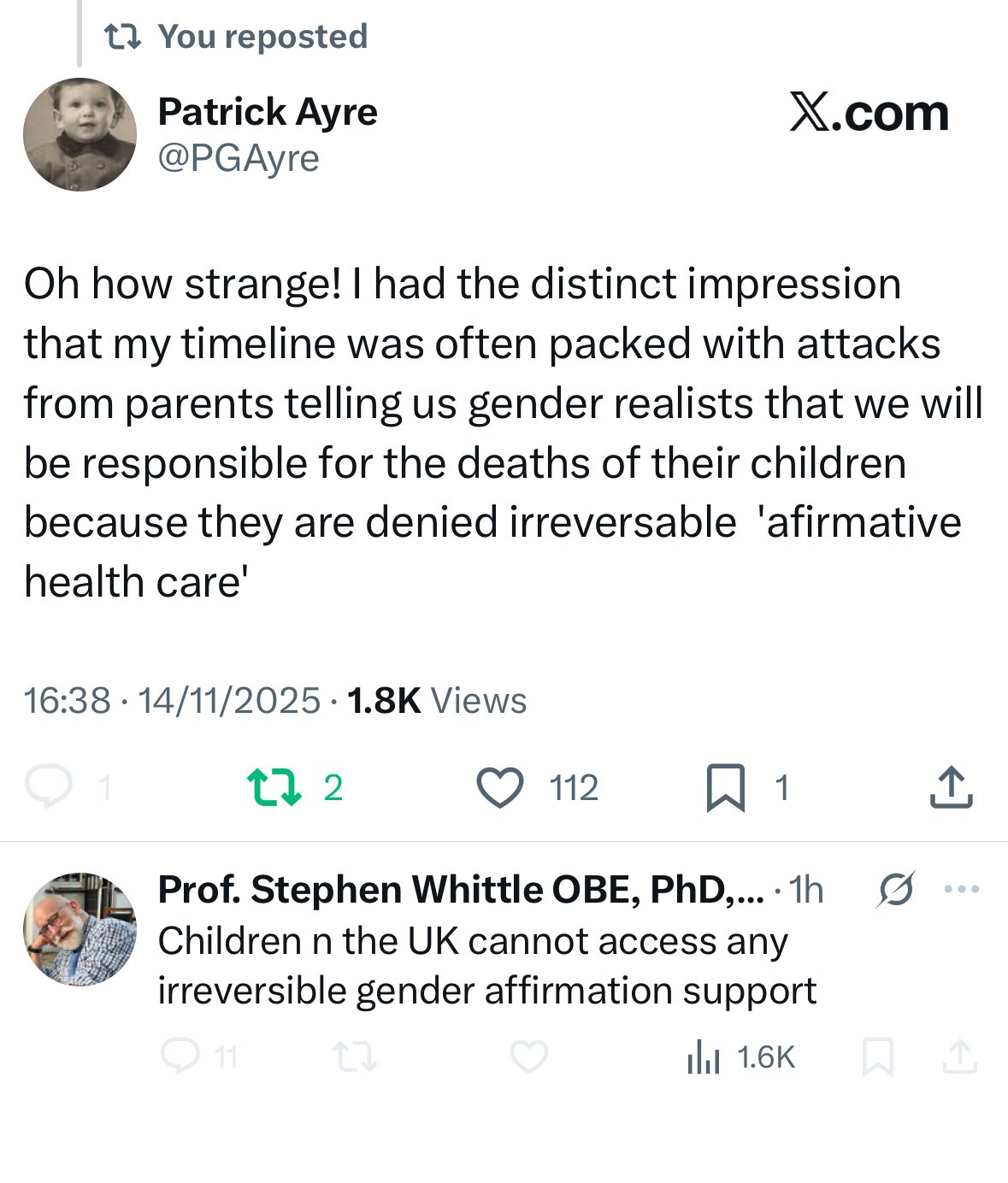 Hopefully Whittle is currently supporting Keira Bell and James Esses to get clarity on the mystery secret Puberty Blocker Trial (LBA yesterday). Thank goodness she is fully on their side!