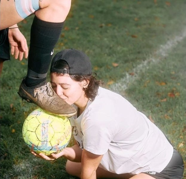 "Club chair Gaia Laidler is now almost prone in the mud, the better to kiss the boots of teammate Sammy Rees. Rees certainly earned it – she he scored four of the six goals and set up the other two. The camera loves it, and so, despite a mouth full of dirty Nike, does Laidler."