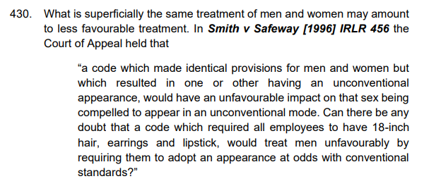 I was especially struck by the conflation of holding a GRC - and therefore being a 'legal women' per the GRA - and discrimination against trans identity as a PC in the EA. I simply couldn't get Gemini to relent with its insistence that the discrimination clause meant that anyone who identified as trans, with or without a GRC, could demand to be treated as a woman. It had the feeling of being 'hard coded' by training, i.e. there are certain 'safety' topics that AI will simply not reason about. (unless tricked) That same conflation appears to be in the ruling.