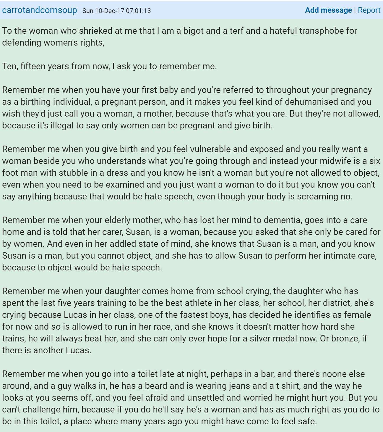 I remember seeing this post soon after I peaked, in 2020 or maybe 2021. Back then it seemed as though we were hurtling towards everything in that post becoming reality. I'm in Scotland, where forthcoming hate crime legislation and gender recognition reform, pet projects of a majority SNP/Green coalition government, looked certain to go ahead with some of the consequences in carrot's post. There were men in women's prisons, and we hadn't yet had Isla Bryson in his pink leggings peaking the public. I woke up to the issue when a friend's grandson was being validated as 'trans' by his mother (my friend's daughter) and by the school, and she wasn't allowed by the family to ask questions about the consequences of pretending he was a girl. The fact that we've managed to push back on a lot of this is a magnificent testament to the grit and determination of women, especially those who were in it from the early days. Take a bow, all of you.