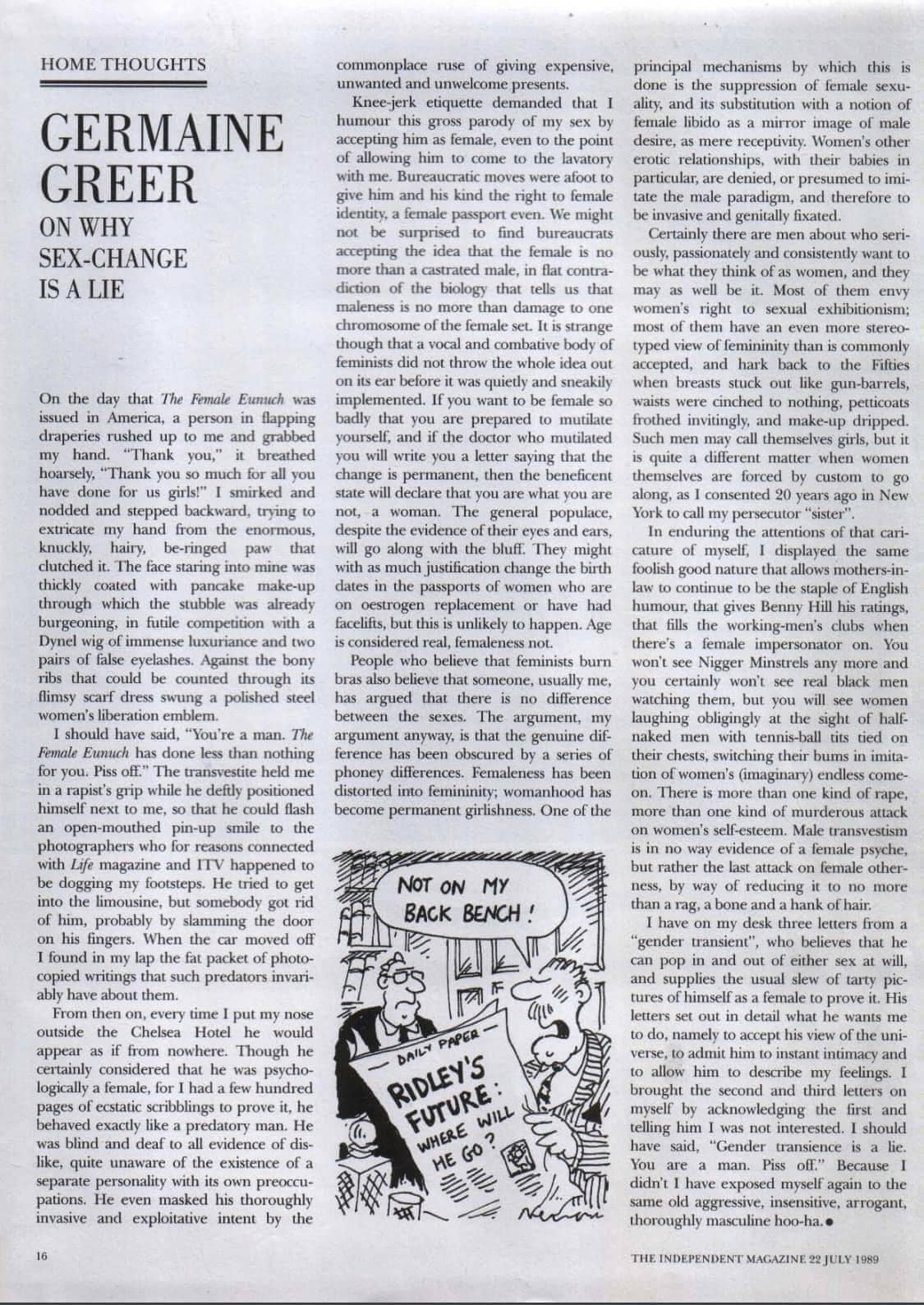 I have on my desk three letters from a “gender transient”, who believes that he can pop in and out of either sex at will, and supplies the usual slew of tarty pictures of himself as a female to prove it. His letters set out in detail what he wants me to do, namely to accept his view of the universe, to admit him to instant intimacy and to allow him to describe my feelings. I brought the second and third letters on myself by acknowledging the first and telling him I was not interested. I should have said, “Gender transience is a lie. You are a man. Piss off.” Because I didn't I have exposed myself again to the same old aggressive, insensitive, arrogant, thoroughly masculine hoo-ha.e