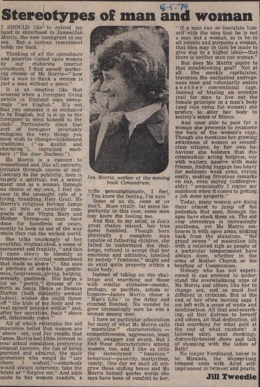 @DAaronovitch @JournalismSEEN @LouiseWluddite @_loobyloo @coccinellanovem @MForstater @JulietVelleman @HJoyceGender This is Jill Tweedie on Jan Morris from 1974!