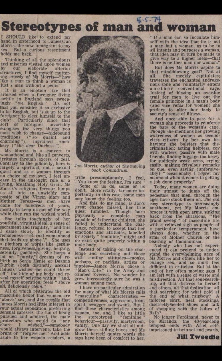Here’s the late Jill Tweedie reviewing Jan Morris’s book in The Guardian. It must be in the Guardian’s archives somewhere. “No longer Ferdinand, never to be Miranda, the 40-year-long tempest ends with Ariel self-imprisoned in twin set and pearls”