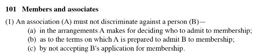 Basically, associations are not allowed to discriminate against a person by eg refusing to accept them as a member. However, there is a specific carve out in Schedule 16 that allows associations to be restricted to people who share a protected characteristic.